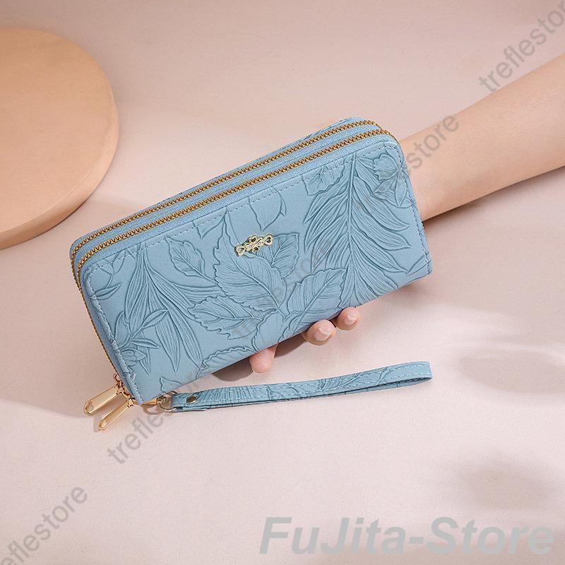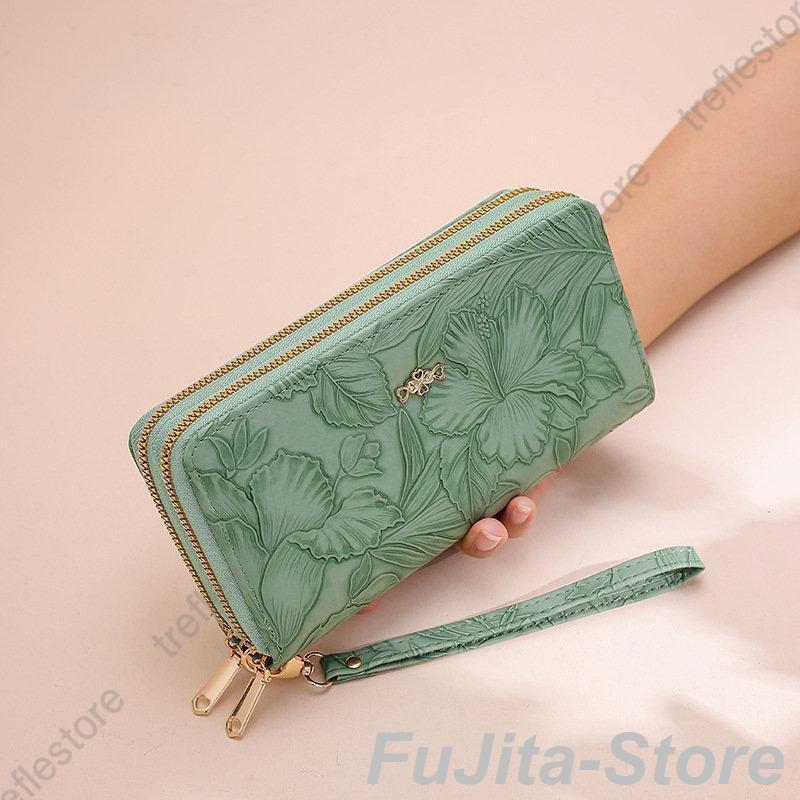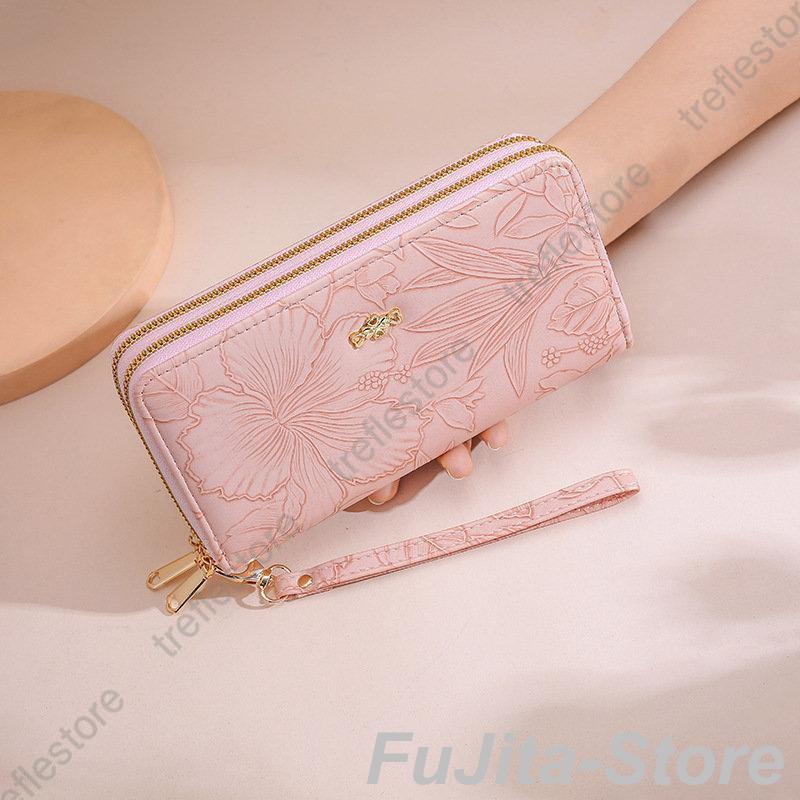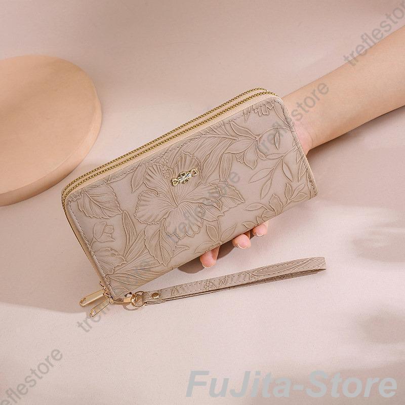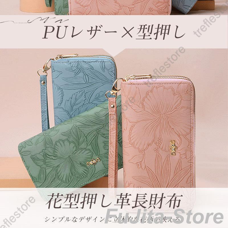 ◎花型押し仕上げが上品で女性らしいデザインの革長財布。